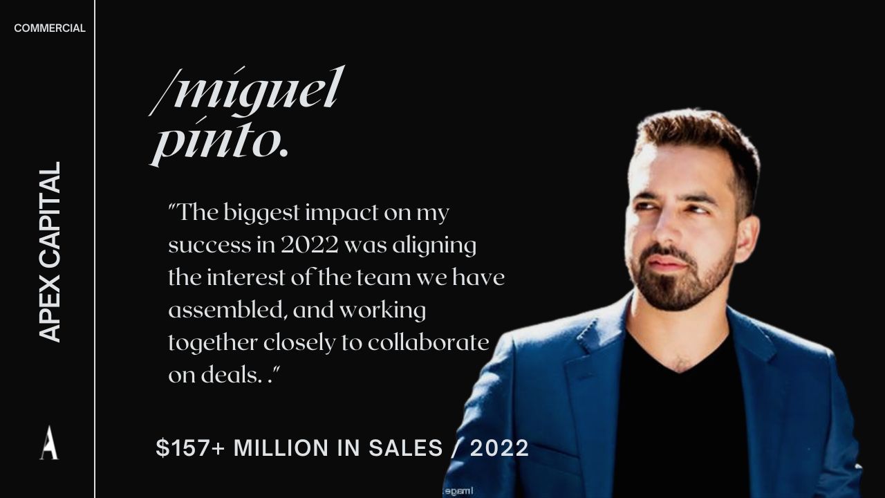 Miguel Pinto has been a commercial broker for over ten years. He is the Founder and Managing Broker of APEX Capital Realty. In 2022, with $157 million individually, and over $300 million with his team.