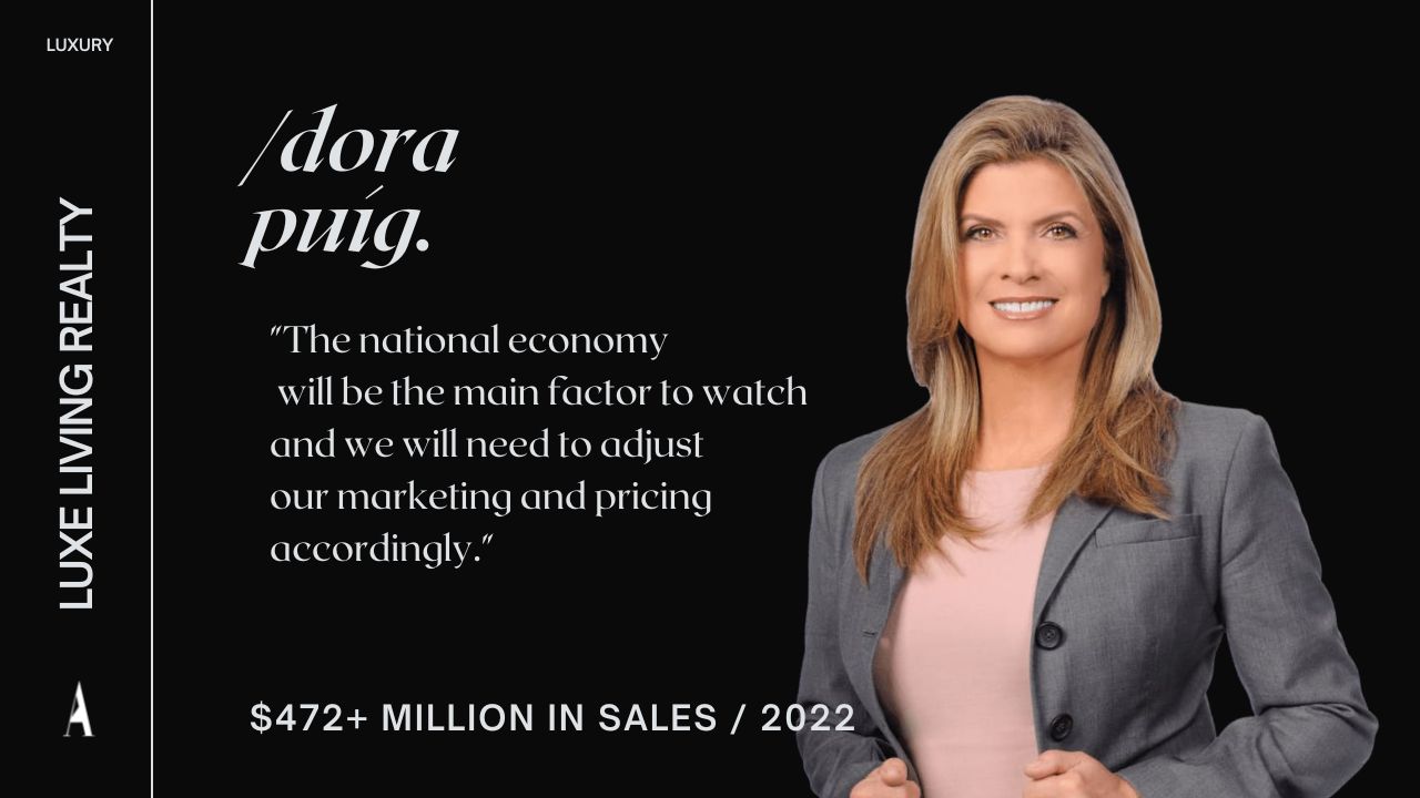 In 2023, she aims to keep working with luxury properties and clients that she enjoys working with. While Dora is concerned about how to continue performing at the same levels she has been, while navigating the tricky economic times ahead of us, she is staying focused on keeping her momentum. "The national economy will be the main factor to watch and we will need to adjust our marketing and pricing accordingly."