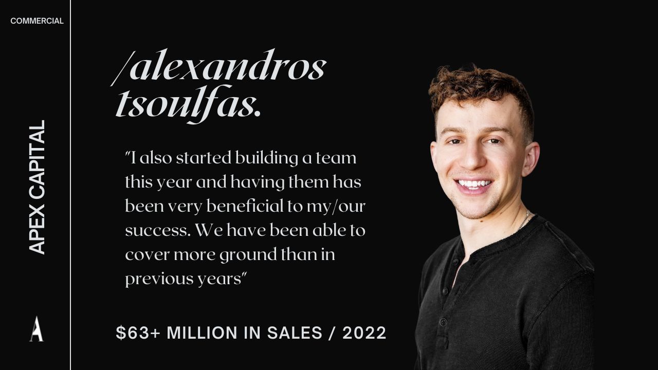 With just 4 years in the real estate industry, Alex Tsoulfas stands out as a rising star with over $63 million in sales in 2022.