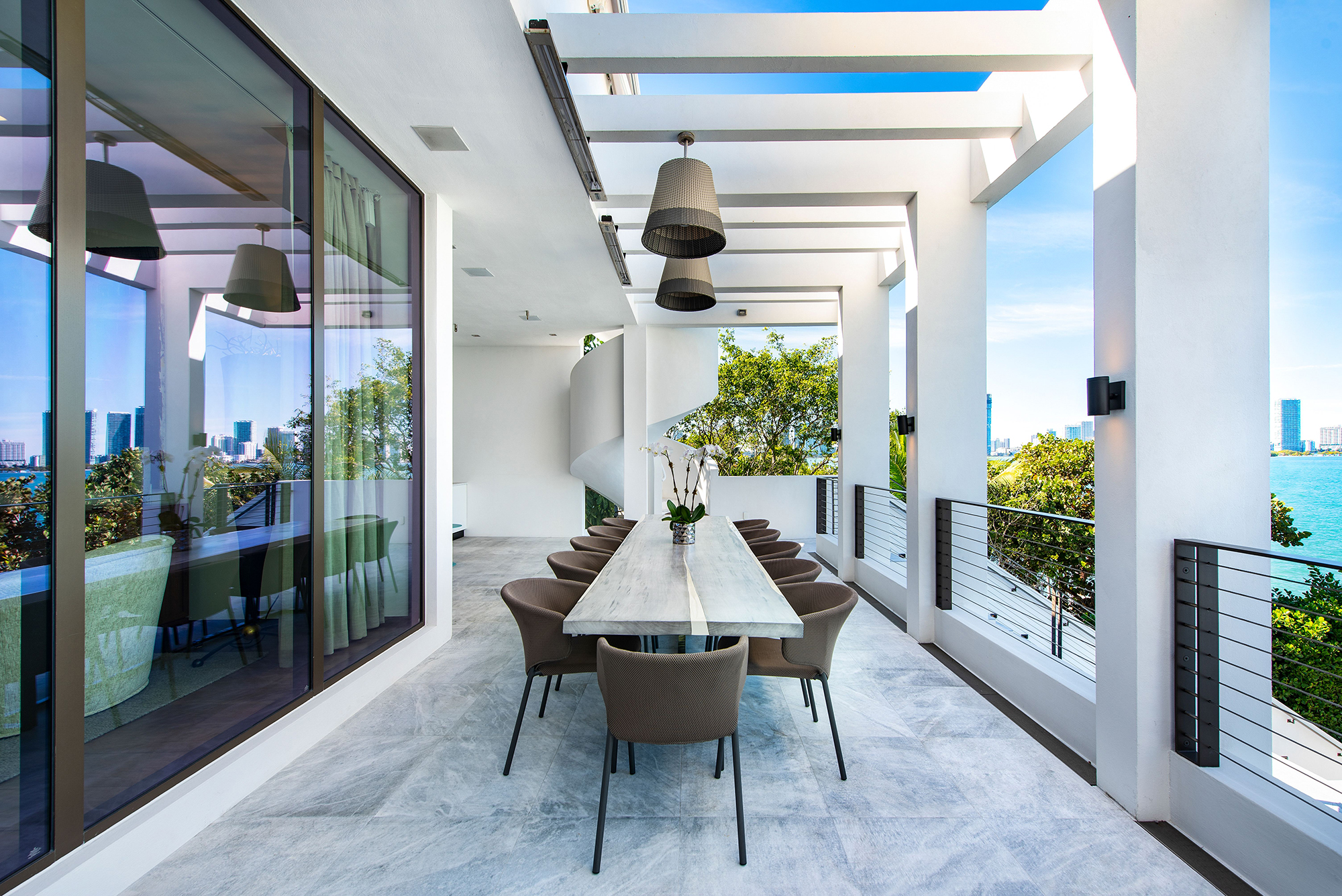 But all this is only the interior. Let’s head outside by the pool and check out the ambiance of the outdoor living spaces. There’s plenty of outdoor living space with two spacious fireplaces along with TVs. The outdoor terrace covered area sums up to almost 1,200 SF. Which, simply put, is a lot. The floor has laser-etched limestone paving all across the exterior spaces and the terraces. The light gray limestone provides excellent contrast with the turquoise pool and the blue Miami waters. The dock downstairs holds exquisite built-in seating as well as a lounging area. The uniquely designed watercraft lifts provide seamless access to the paddleboard or any water vehicles you might keep in the dock.