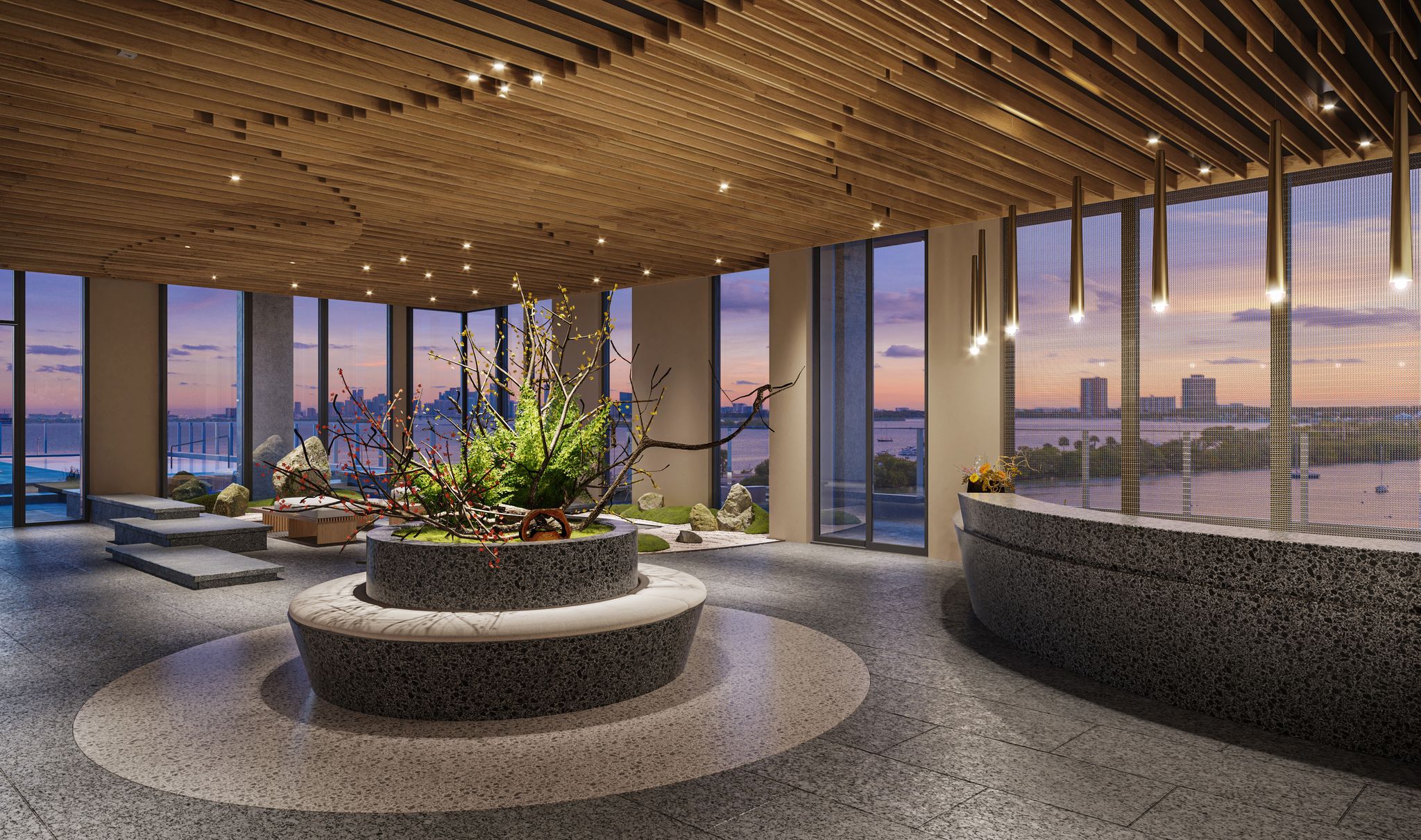 The building features design elements from Tokyo-based ONE DESIGNS Co. Ltd and world-renowned architect Juan Azulay. Surrounded by water and situated on a 33,600-square-foot lot on the Intercostal Waterway, resident will enjoy the swimming pool, fitness center, an elevated garden, a club room with a state-of-the-art fully equipped chef’s kitchen.